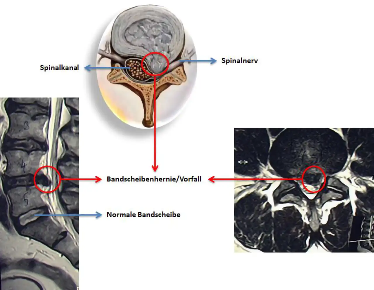Je nach Lokalisation und Grösse des Bandscheibenvorfalls können lokale Schmerzen mit oder ohne Ausstrahlung auftreten. Die Diagnose wird mittels Anamnese und klinischen und neurologischen Untersuchungen sowie allenfalls MRI und Computertomographie gestellt. Diese Untersuchungen führen schlussendlich zu einer exakten Diagnose.
